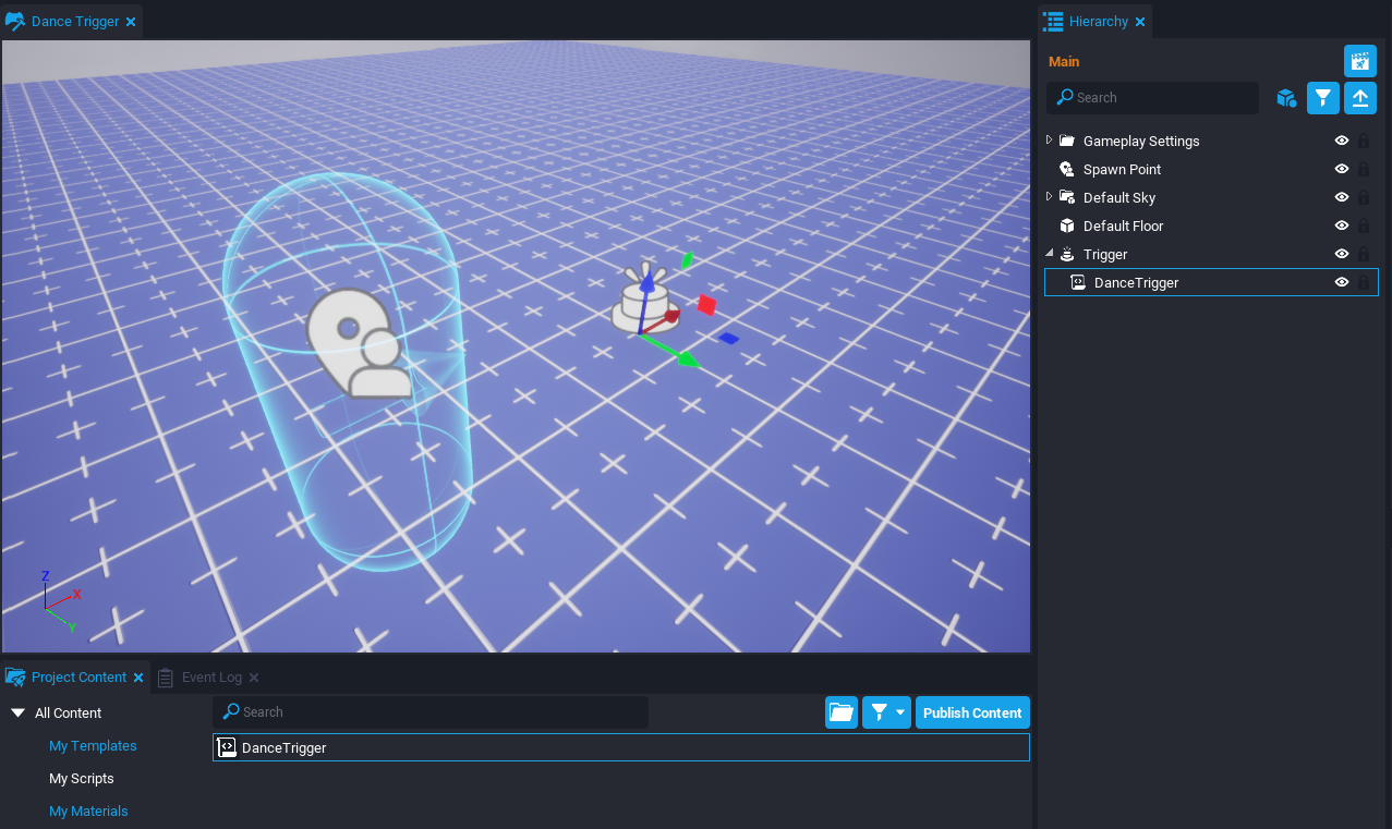 The generated DanceTrigger script has code that will print messages to the Event Log when a player begins and ends an overlap with the trigger. Open the Event Log window and preview the project. Then notice if any messages are printed when the player overlaps the trigger.