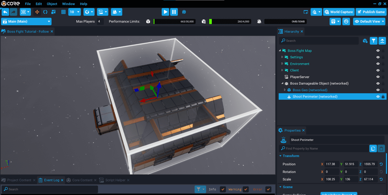 In this tutorial you are going to create a multiplayer boss fight. Players will need to disable all of the generators by inserting a pickup that can be found around the map. After all generators have been disabled, the boss will then be vulnerable to damage.
