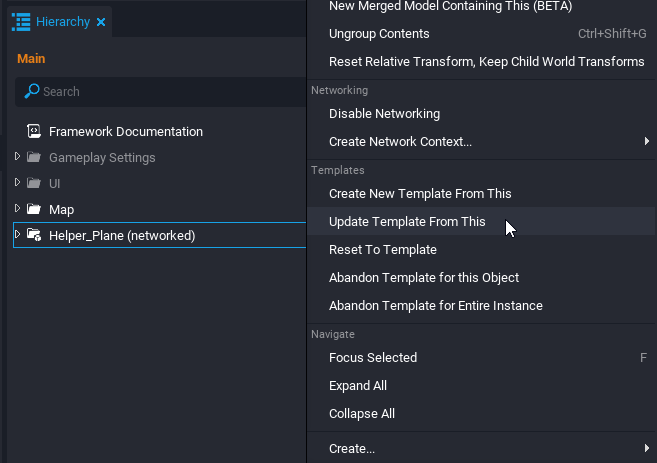 Once you are done adding changes to the plane model, right click the Helper_Plane and select Update Template From This. After, delete Helper_Plane from the Hierarchy.