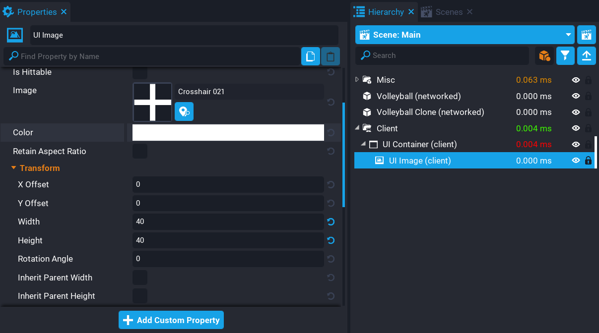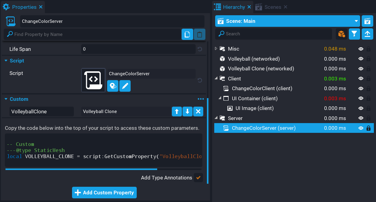 1. Add the Volleyball Clone object as a custom property on the ChangeColorServer script.