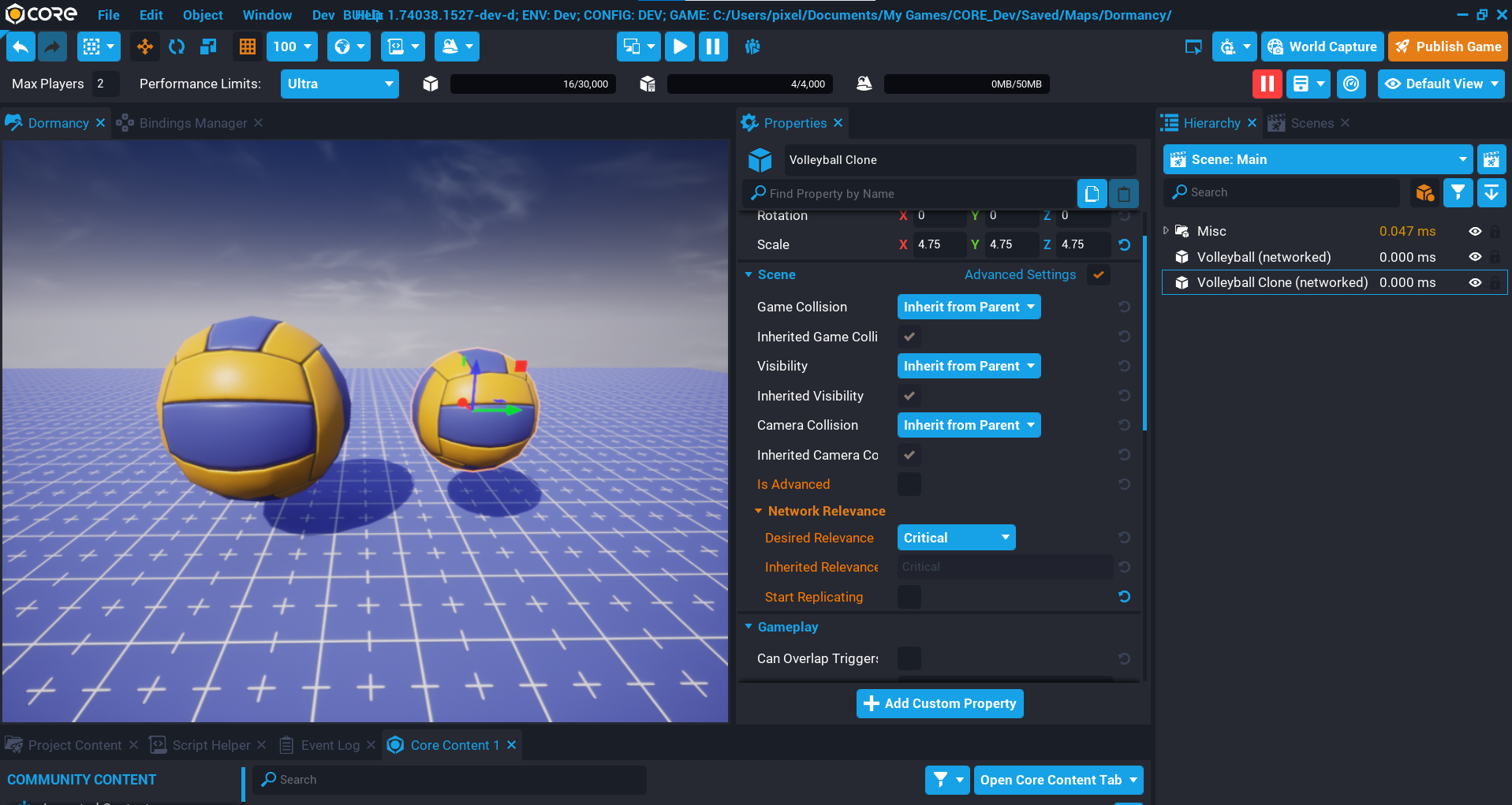 5. In the Properties window for the Volleyball Clone object, disable the option Start Replicating under the Network Relevance group.