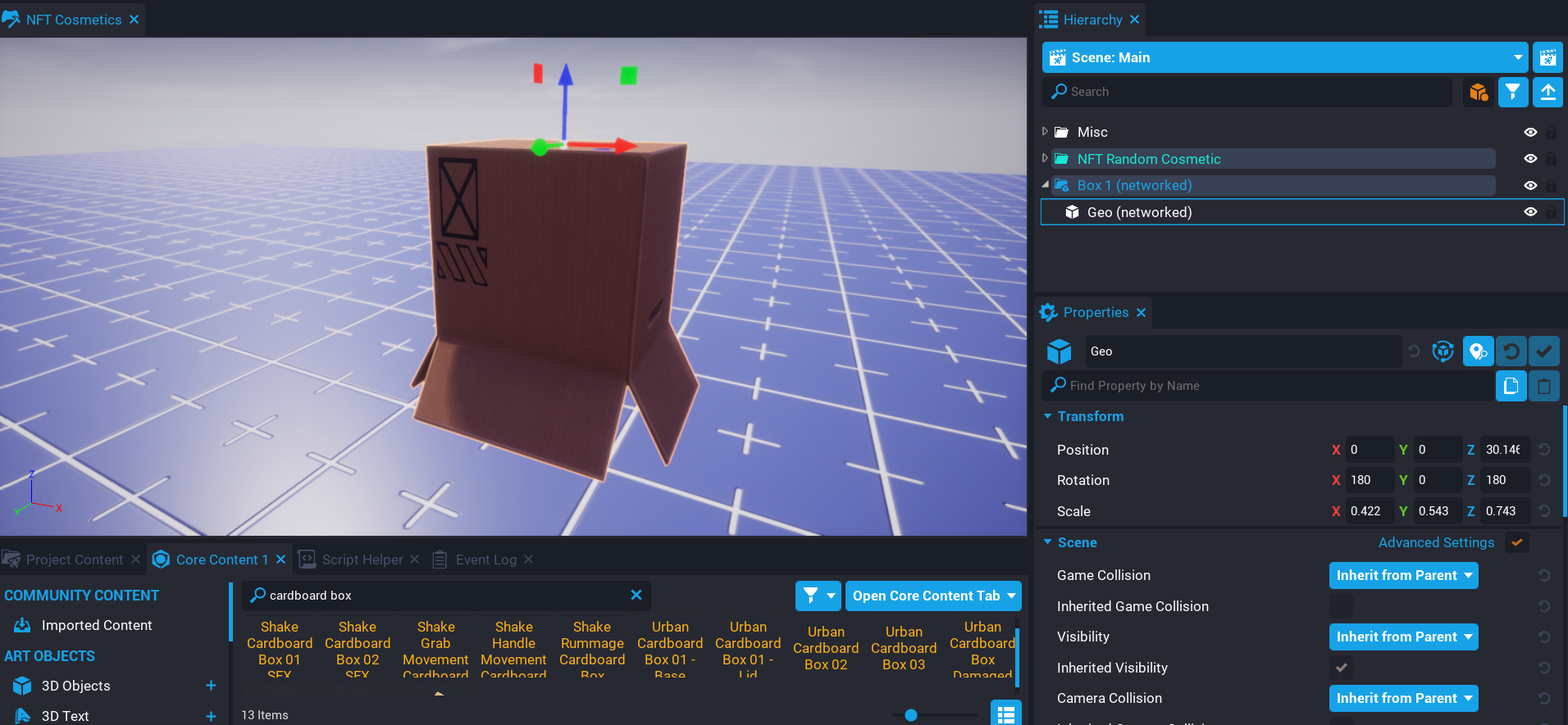 This tutorial will use an existing NFT collection that uses the cardboard boxes from Core Content. For example, looking at NFT #3 in the collection, we can see it has attributes for Box and Color. The Box attribute is the row index from the data table of templates. This could be your data table of templates that make up how the cosmetic looks.