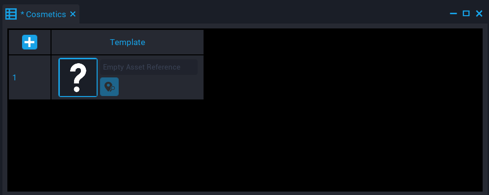 Create a data table called Cosmetics and add 1 column called Template that is an Asset Reference type.