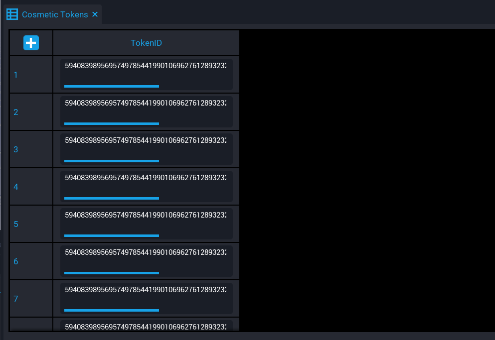 Create a new data table called Cosmetic Tokens. This table will have 1 column called TokenID which is a string type.