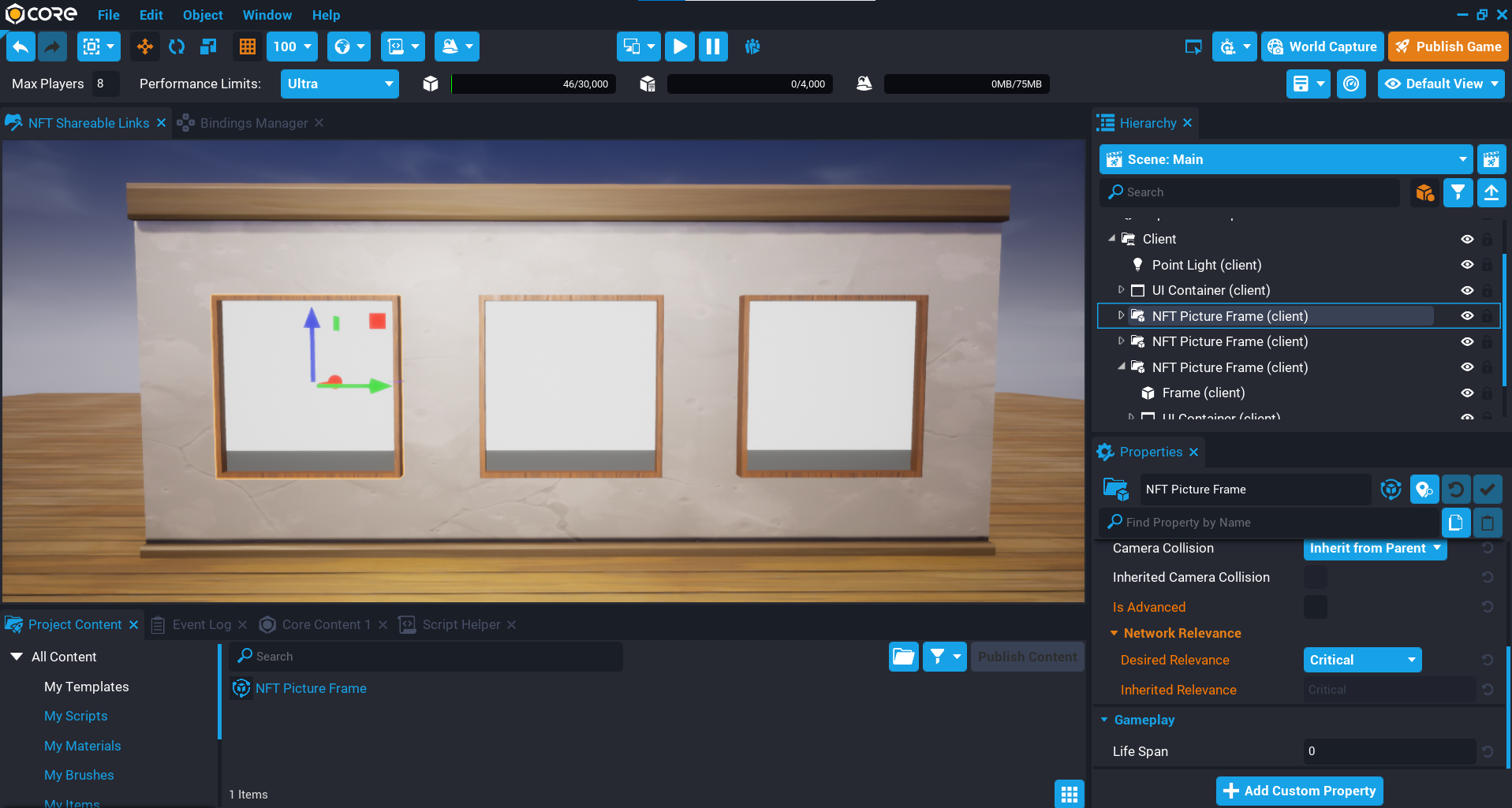 The picture frame will be used to display the NFT image and name. This template will be updated to contain a script so that the frame can be placed anywhere, and can also be duplicated to have multiple instances of it.