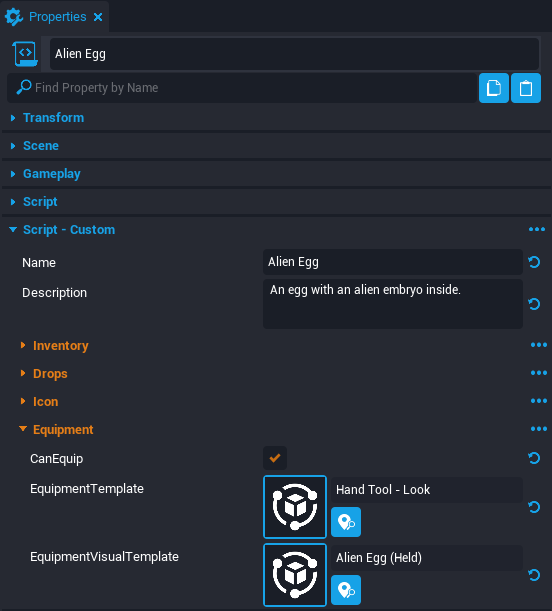 Alien Eggscript and open the Properties window. - Set the DropTemplate property to Alien Egg (Drop Icon).