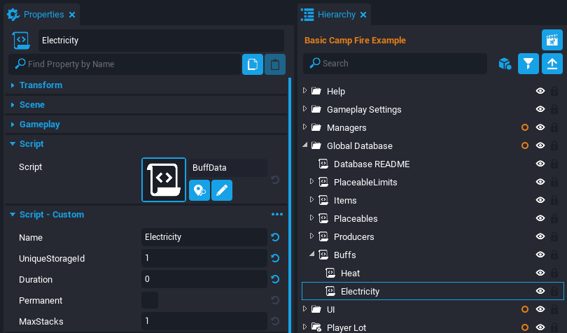 The project is divided into Scenes which showcase different ways the Producers, Buffs and Areas systems can be used to create gameplay. To access the Scenes window, click Window in the top menu bar and select Scenes. Double-click the Basic Camp Fire Example to the load the correct scene.