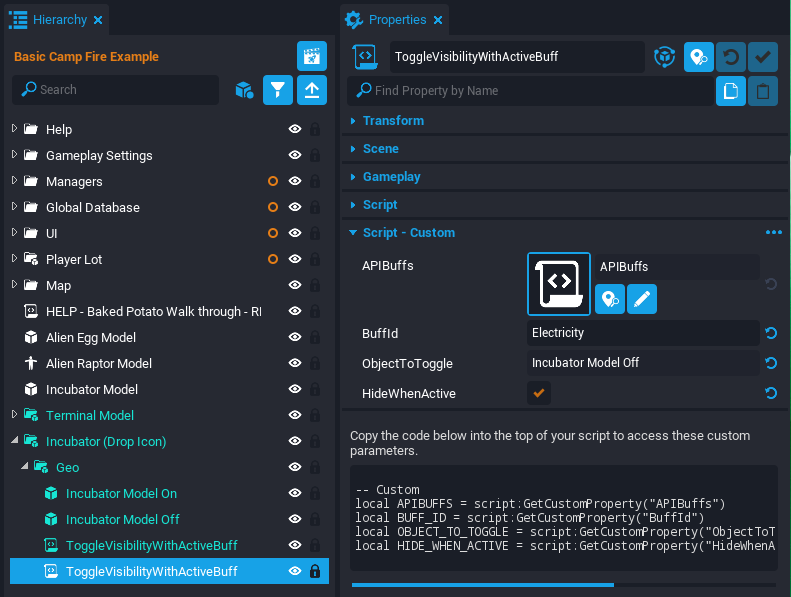 Expand the Incubating Egg script and then expand the Drops script. Rename the Cooked Fruit script to Alien Raptor. Select the Alien Raptor script and open the Properties window. Set the ItemId property to Alien Raptor.