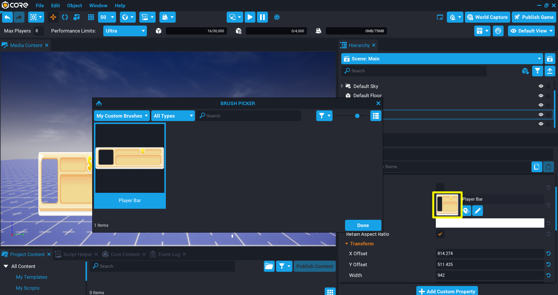 All assets created from the Media Library can be found in My Brushes in the Project Content window. These brushes can be used in the UI by dragging them into the preview window or Hierarchy.