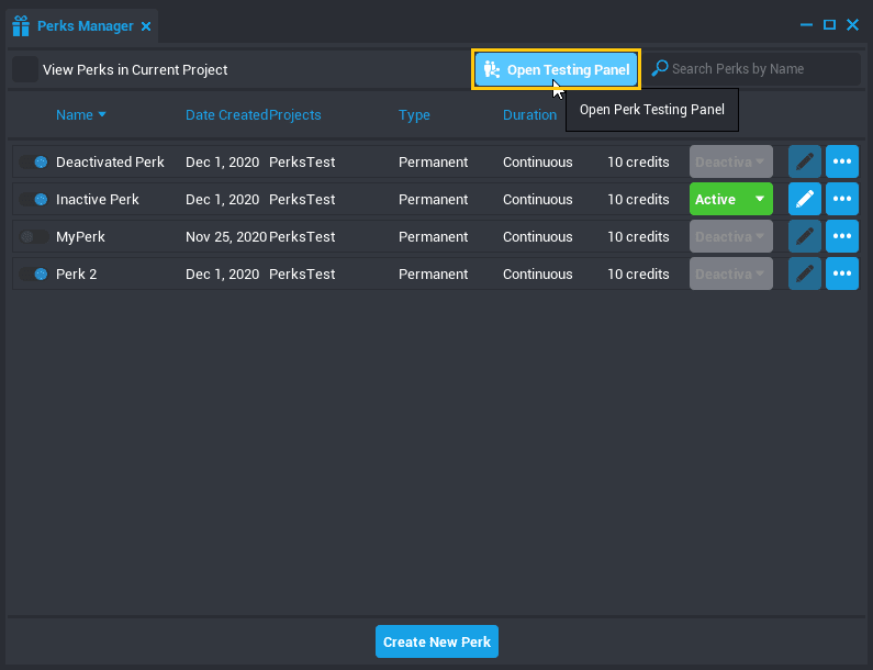 Perks are created and edited through the Perks Manager window. They can be associated with just one project, or many projects by the same creator.