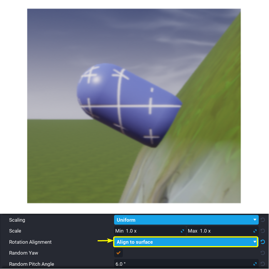The Surface Alignment property determines how the foliage will be oriented when generated. There are three different alignment options: Align to terrain Up, Align to surface, and Random Align. The Align to terrain Up option will align the foliage with the z-axis of the terrain. The Align to surface option will align the foliage perpendicularly to the slope of the specific point of terrain that the foliage instance is on. The Random Align will randomly assign the Align to surface or Align to terrain up for each foliage instance.