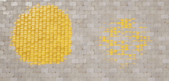 Many of the available materials have depth aspect to them. For example in the video above, the dirt material will sometimes display below the stone material. This is due to the fact that the materials built into Core have a depth property associated with each pixel. In the image below, the left side Food Corn 01 material is at 100% strength on the left and completely covers the Bricks Worn Stone 01 material. On the right side, the Food Corn 01 material is at 50% strength on only partially covers the Bricks Worn Stone 01 material depending on which spots of the Food Corn 01 material are highest.