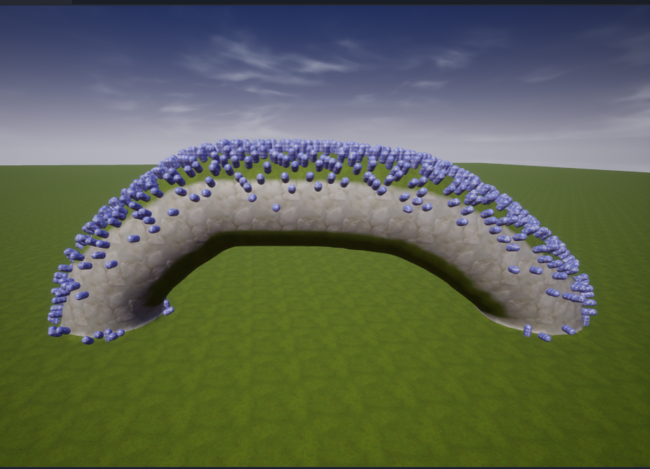 The Ground Slope Angle controls the type of slope the foliage is allowed to spawn on. Ground Slope Angle can be used to prevent foliage like trees from spawning on the side of a cliffs. The Group Slope Angle property has two settings. The first setting is the minimum slope angle. The second setting is the maximum slope angle. The table below demonstrates how manipulating the first and second settings for the Ground Slop Angle property changes the locations that foliage spawns at.