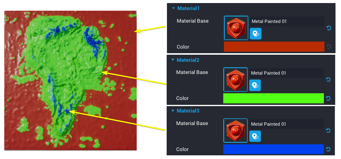 In the Material Editor there are four sections that correspond to the four different materials available when painting on terrain: