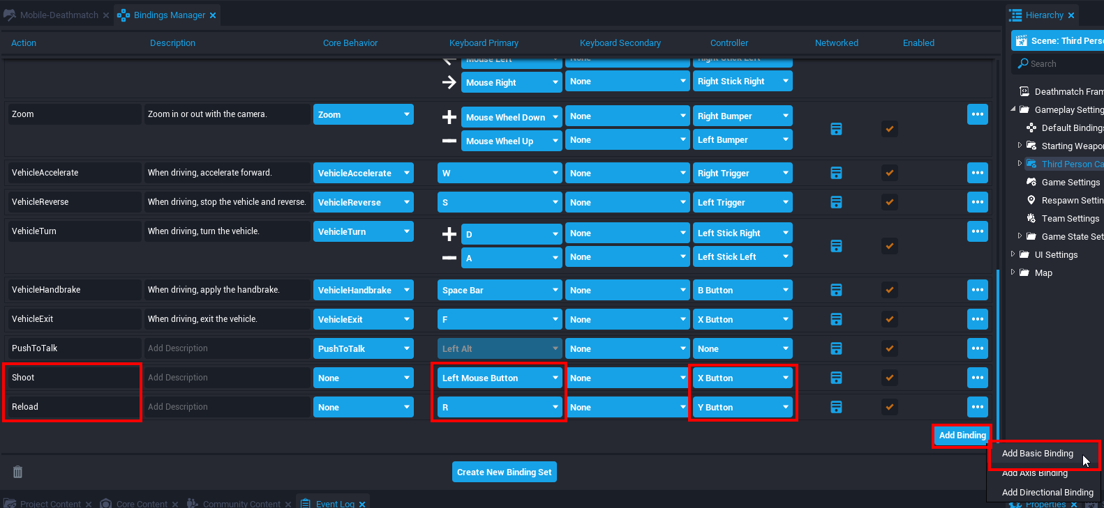 With the new bindings created, it is now time to connect the actions to their functionality. This could be activating a weapon's ability or a script that runs a certain function when an action occurs.