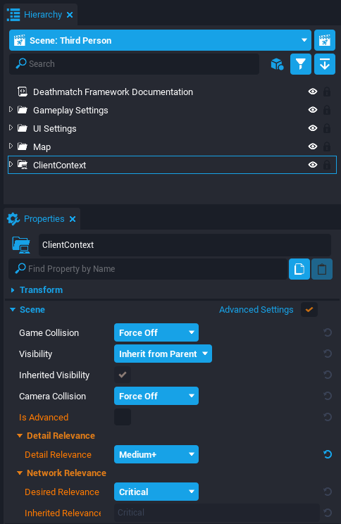 With the Client Context selected, open the Properties window and enable the Advance Settings option. Change the Detail Relevance property to Medium+.