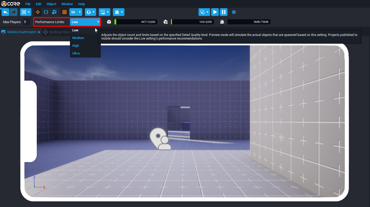 The Core Editor has some useful tools to assist creators in making their games mobile-friendly. Using a Binding Set will help connect an action to multiple types of device inputs. The Device Preview Options can help preview gameplay and UI on a variety of devices. There are also performance restrictions on smaller devices that may require some objects only being rendered based on the device quality.