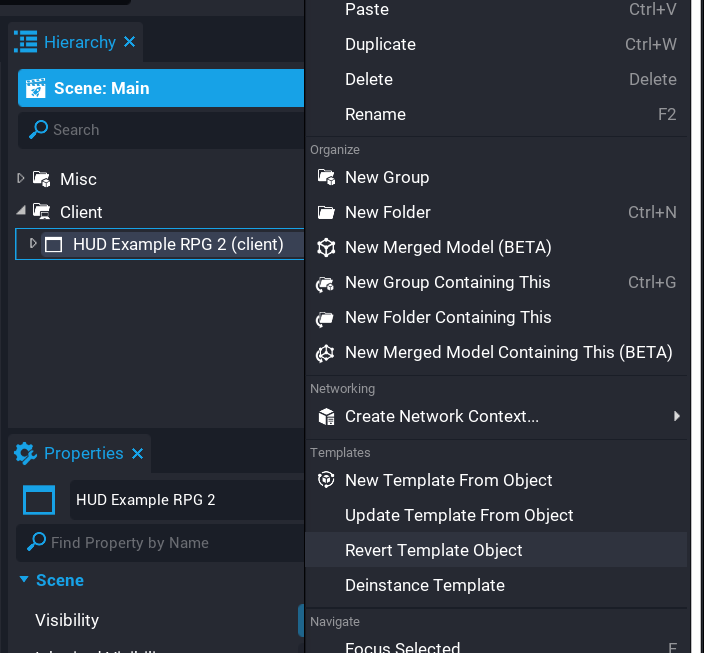 In the Hierarchy right-click on the HUD Example RPG 2 template and select Revert Template Object. This will revert the template back to its original state when you imported it into your project.