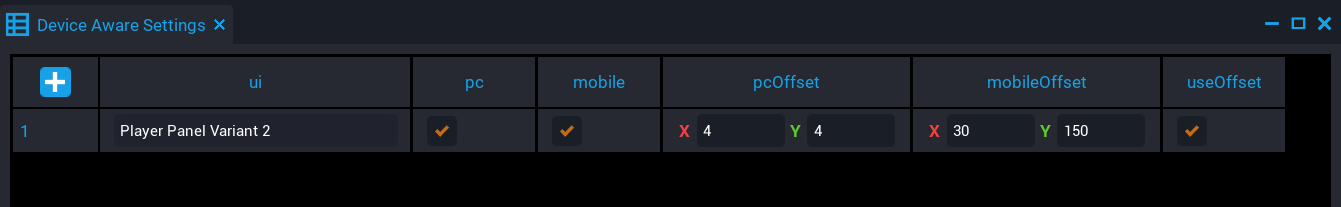 Add a new row to the data table. This row will focus on the player panel that appears top left of the screen. This panel needs to be displayed on PC and Mobile devices and also be moved down in the Y position when the mobile buttons are displayed for Touch input.