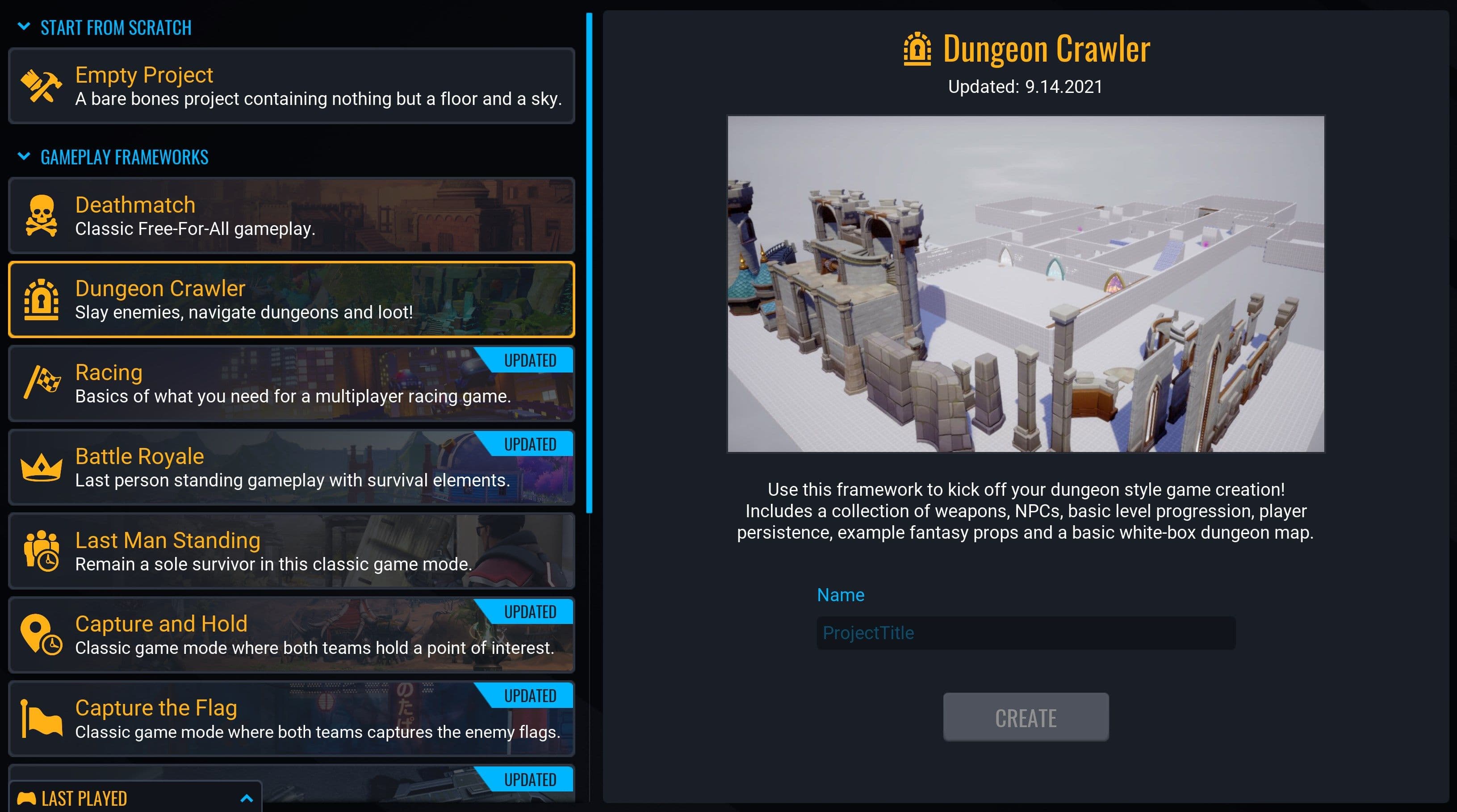 - In the GAMEPLAY FRAMEWORKS section, select Dungeon Crawler.