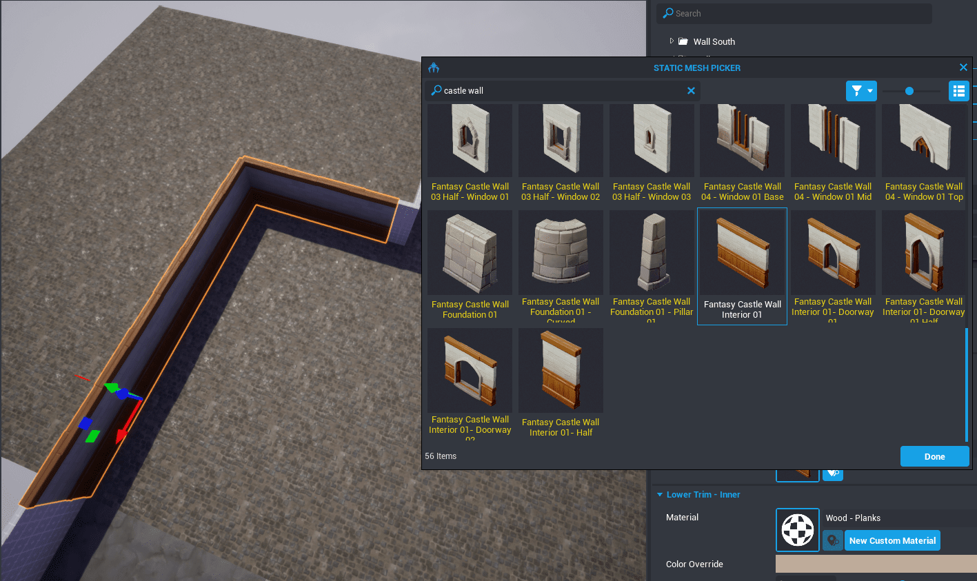 castle wallto find a wall to use, like Fantasy Castle Wall Interior 01. - When you select the new mesh, it should immediately apply to the selected objects.