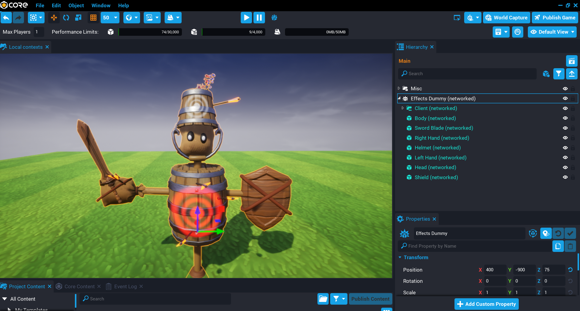 The Local Context will contain all the objects that would normally be networked. These objects (including scripts), will be spawned on the server and the client. The local context you will create will need to have networking enabled. The reason for this is that the custom networking method you will be using in this case is Dynamic Properties**. All health data for the damageable objects will be sent to the clients this way.