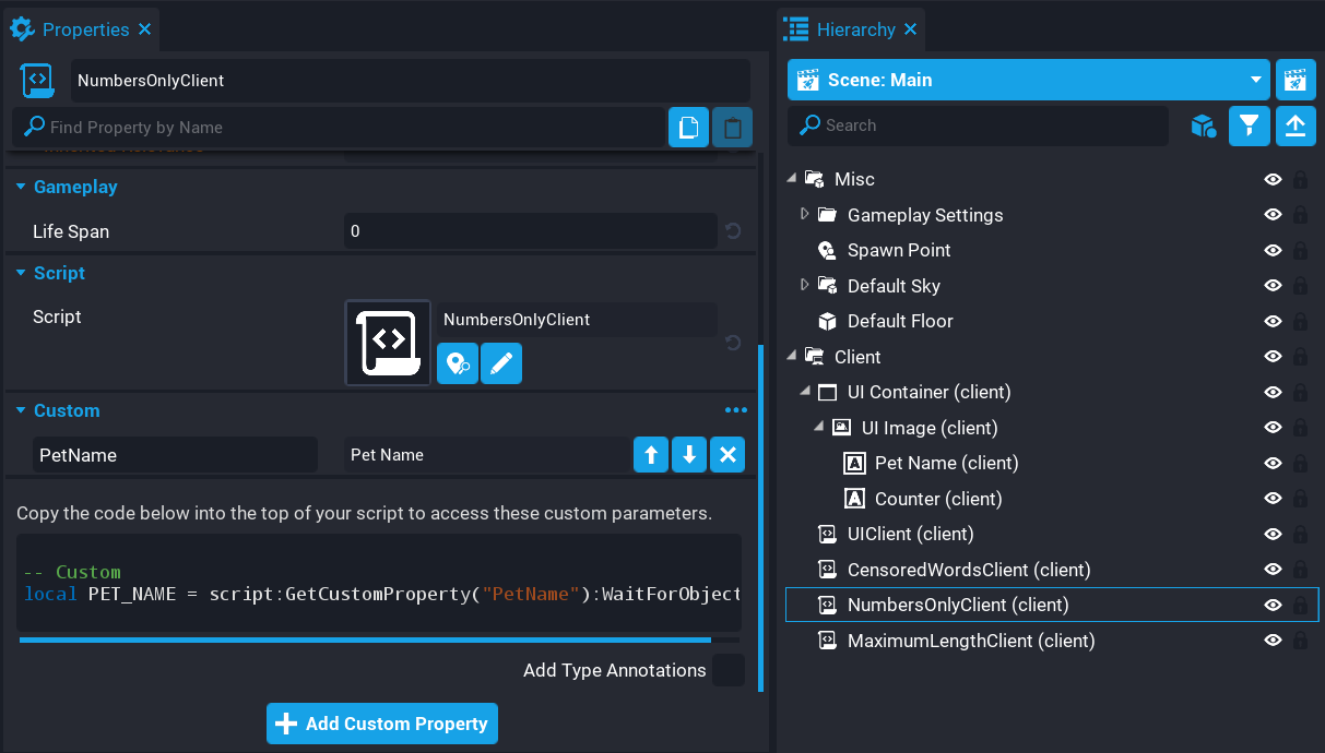 In this tutorial, you will learn how to validate the text that players can enter into a UI Text Entry Box to make sure only certain values or lengths can be entered in the field. Validation can be done for numeric values and text. For example, a player that can enter a name for a pet they own might need restrictions on the length of the name, and what characters or words are used.